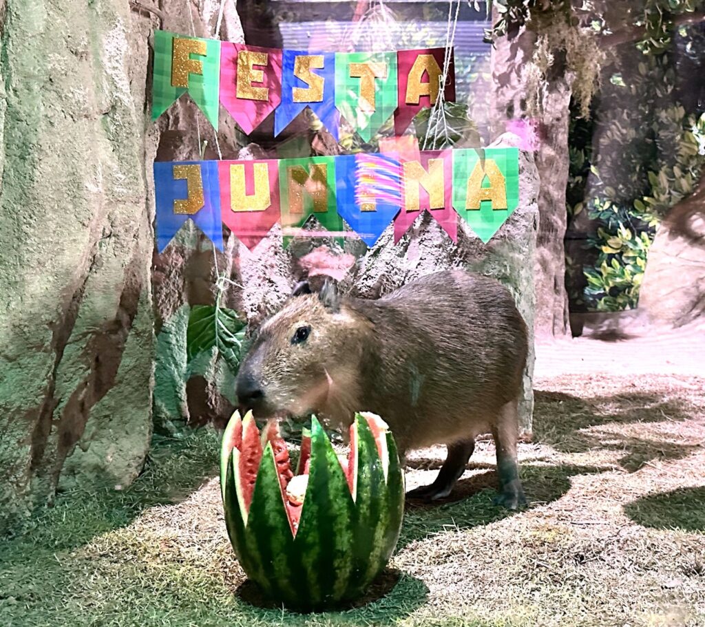 Com bandeirinhas de couve, fogueira de melancia e outras surpresas, o enriquecimento ambiental temático garante diversão