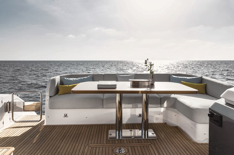 Entre os destaques da embarcação está a cozinha posicionada próxima à praça de popa para integração total com a área externa e o sistema de navegação com comando por joystick e controle digital via touchscreen e tablet. A Azimut Fly 58 também incorpora sensores de monóxido e dióxido de carbono em todos os ambientes, assegurando altos padrões de segurança.