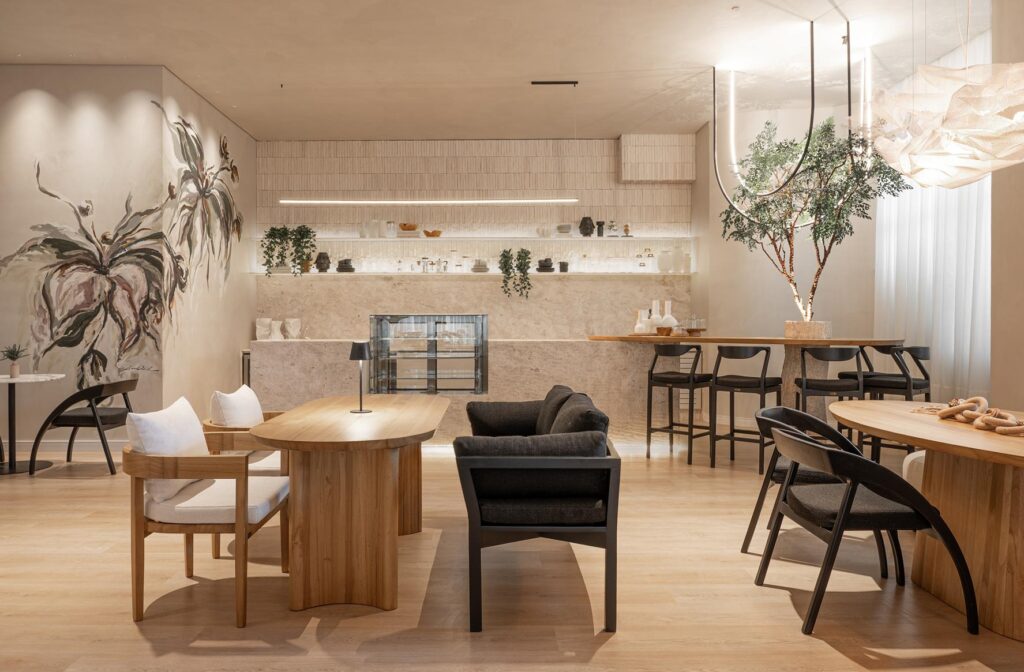 Neste ambiente, cada detalhe foi pensado para celebrar os encontros. Inspirado no tema Semear Sonhos, ele nasce do desejo de transformar refeições em rituais de conexão. Materiais naturais como madeira e pedra, aliados aos princípios da biofilia, reforçam a harmonia entre arquitetura e natureza. Destaque para os tons de marrom, base perfeita para o verde oliva que aparece nos revestimentos, na pintura e na vegetação, reforçando a proposta de integrar natureza e arquitetura de forma harmônica.
