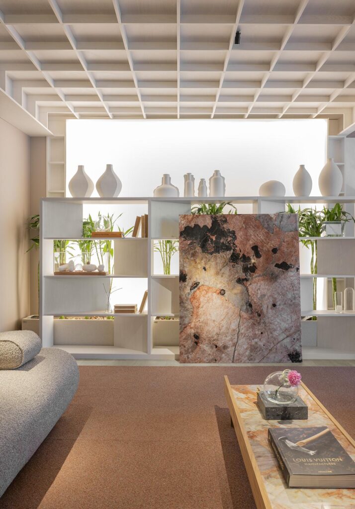 Um refúgio dentro da mostra, onde tempo e espaço se moldam ao prazer do encontro. Um convite a desacelerar. O layout flui naturalmente em 148,80 m2, com formas orgânicas e circulações amplas, com uma atmosfera de espaço gourmet residencial. De um lado, o café, ponto de partida das boas conversas; do outro, os vinhos, em um lounge acolhedor com banquetas altas. Mobiliário confortável, obras de arte, acabamentos naturais, tecidos com texturas aconchegantes. A paleta é leve, com tons neutros. A operação fica por conta da Garbo DiKa eventos.