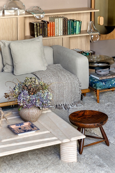De um lugar de afeto e conexão nasce o Loft Kaá. Assinado pelo casal de arquitetos, o nome do ambiente traz a atmosfera da natureza em um espaço de 62 m². O projeto propõe um mergulho na biomimética, trazendo laços fortes com pedras naturais exóticas. Estrela do ambiente, a Patagônia Scarlet é uma pedra composta por cristais rosa. Outros elementos como a madeira e o couro do peixe pirarucu aplicado na mesa lateral do sofá, trazem significado sensorial ao espaço.
