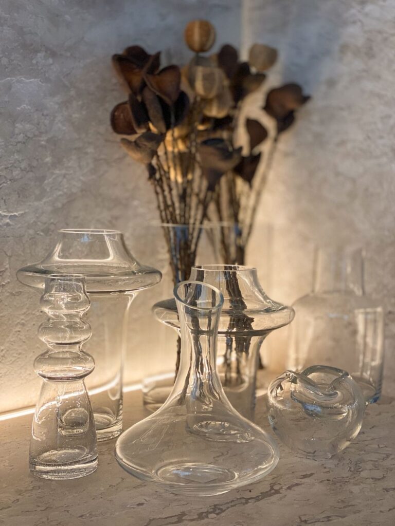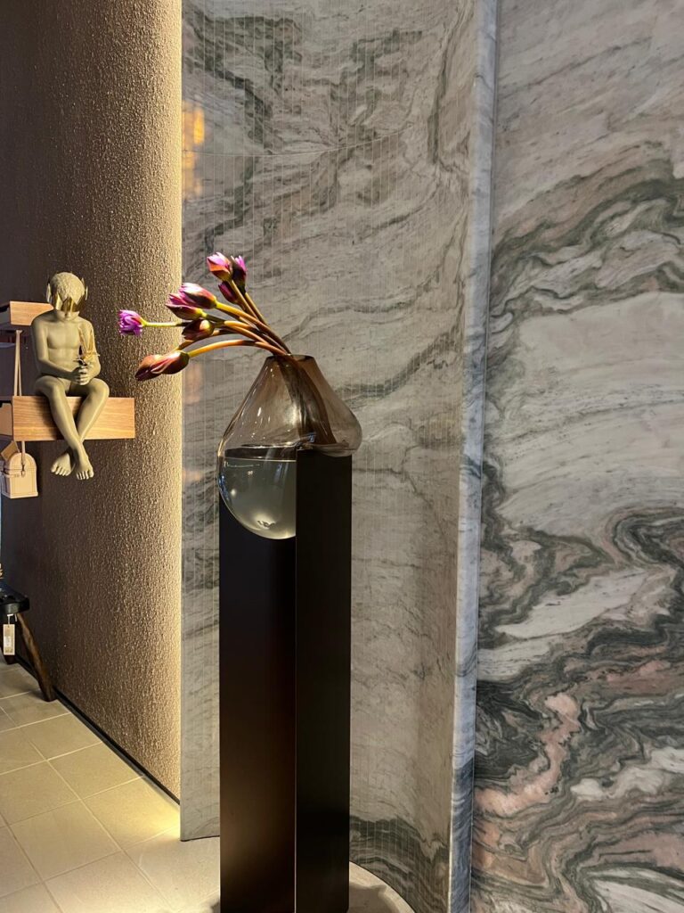 “Como o ambiente é inspirado numa casa de golfe, resolvi trazer um pouco do que o esporte representa, essa elegância, o contato com a natureza. E essa imagem reflete isso, mostrando a pedra natural e a arte, que traduz essa peça assinada por mim, composta por uma base metálica com um vidro soprado, Murano. Também destaco a escultura atrás, que demonstra esse apelo ao elemento natural e esse contato da natureza com o golfe”, diz o profissional.