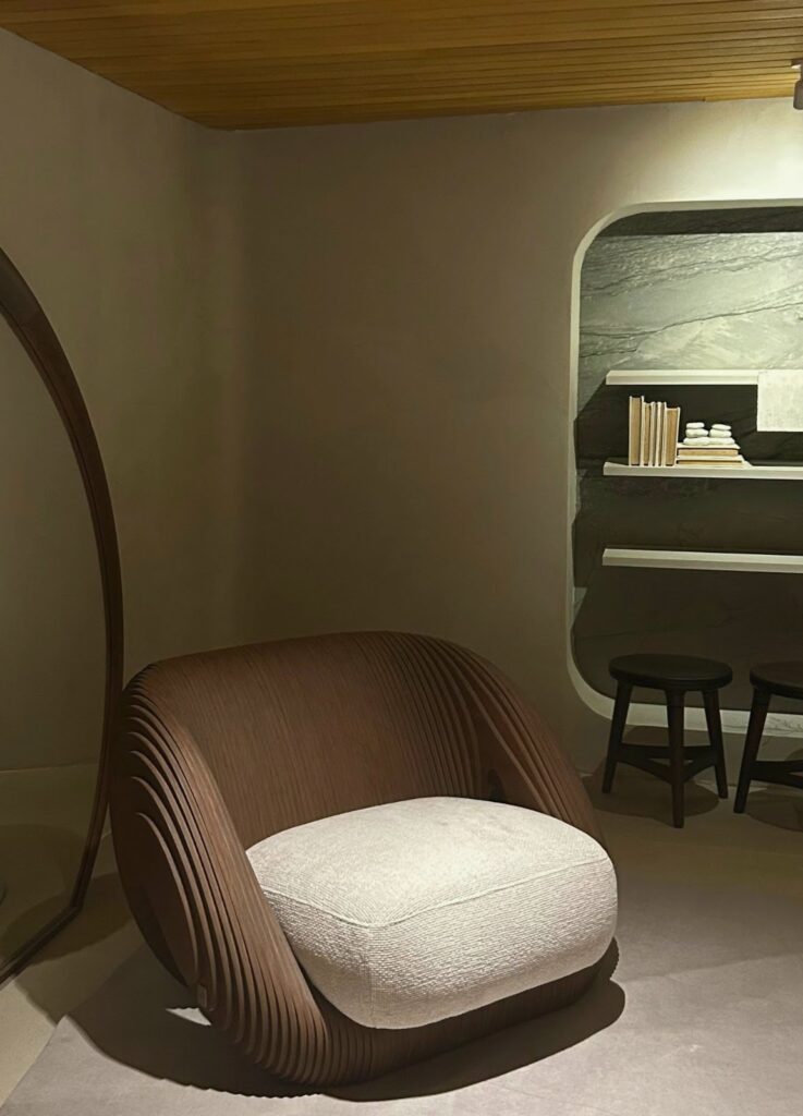 Um refúgio dentro da mostra, onde tempo e espaço se moldam ao prazer do encontro. Um convite a desacelerar. O layout flui naturalmente, com formas orgânicas e circulações amplas, com uma atmosfera de espaço gourmet residencial. De um lado, o café, ponto de partida das boas conversas; do outro, os vinhos, em um lounge acolhedor. Mobiliário confortável, obras de arte, acabamentos naturais, tecidos com texturas aconchegantes. A paleta é leve, com tons neutros.