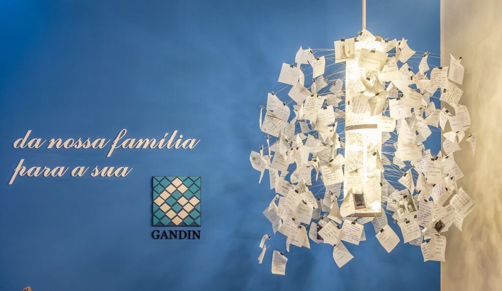 Assinado por Marice Gandin e Giulia Bogo, o lounge da Gandin na CASACOR SC | Itapema 2025 propõe uma experiência sensorial com lustre interativo inspirado na peça Zettel’z 5, de Ingo Maurer, onde o público pendura bilhetes manuscritos. O ambiente homenageia a história da construtora com peças que remetem às obras.