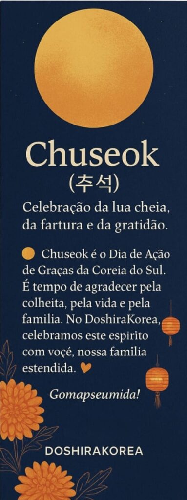 O coração de Florianópolis vai pulsar em ritmo coreano neste final de semana. Nos dias 03 e 04 de outubro (sexta e sábado), o DoshiraKorea convida clientes, amigos e curiosos a vivenciar o Chuseok, o tradicional Festival da Colheita da Coreia do Sul, uma das celebrações mais importantes do calendário lunar.