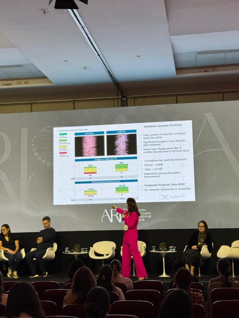 A dermatologista Débora Cadore, especialista em doenças capilares e do couro cabeludo, foi uma das palestrantes do ARIS Congress 2025 (Aesthetic Regenerative International Summit), realizado nos últimos dias 7 e 8 de novembro no Centro de Convenções Rebouças, em São Paulo. No sábado, em sua palestra, a médica catarinense abordou o tema “Uso de células da gordura no tratamento das alopécias”, apresentando o que a ciência revela sobre o assunto e como essas descobertas são aplicadas na prática clínica diária. Segundo a especialista, pioneira no mundo nesta técnica, o tema é fundamental, pois evidencia que já existem terapias regenerativas eficazes para doenças antes consideradas sem solução.
