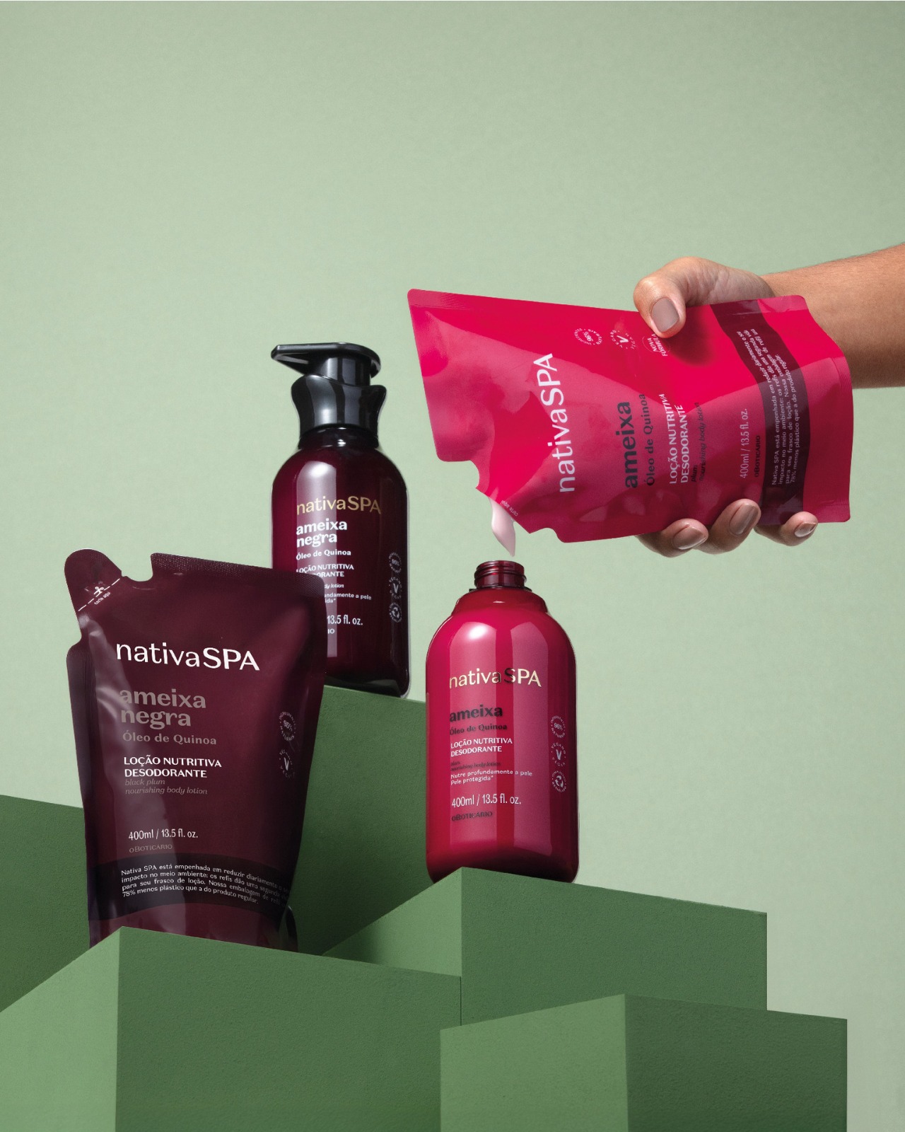 Além de estimular a experimentação e o uso dos produtos, a marca destaca os benefícios de optar pelos refis, que geram menos resíduos a longo prazo e reduzem o impacto ambiental. Quando um refil é produzido, utiliza-se uma quantidade menor de plástico em toda a cadeia produtiva: por exemplo, na linha Nativa SPA, o refil de 350 ml utiliza 78% menos plástico do que a embalagem regular de 400ml.