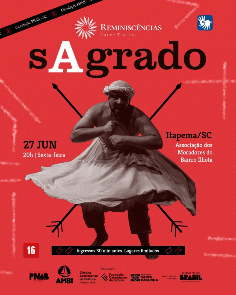 Herança dos povos trazidos do continente africano ao longo de séculos de escravização, as religiões de matriz africana fazem parte da identidade múltipla e miscigenada do povo brasileiro. Em muitas ocasiões, no entanto, são alvo de perseguição e de fortes manifestações de intolerância religiosa. No espetáculo sAgrado, o ator João Tomaz Santos, do Grupo Reminiscências, apresenta a fé, a dança, os cantos, os ritos e, sobretudo, as suas próprias memórias como forma de expressão dessa religiosidade. Em circulação pelo litoral catarinense, a peça será apresentada na Associação dos Moradores do Bairro Ilhota (AMBI) nesta sexta-feira (27), às 20h, com entrada gratuita. A classificação indicativa é 16 anos.