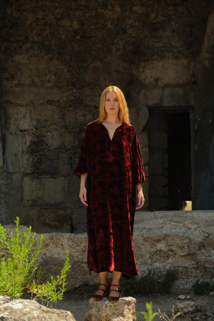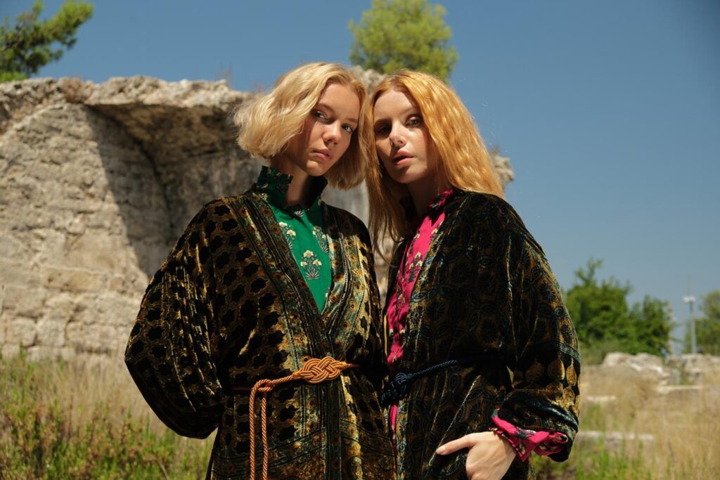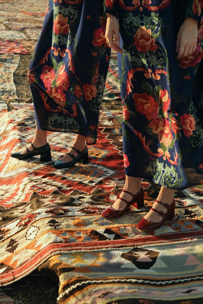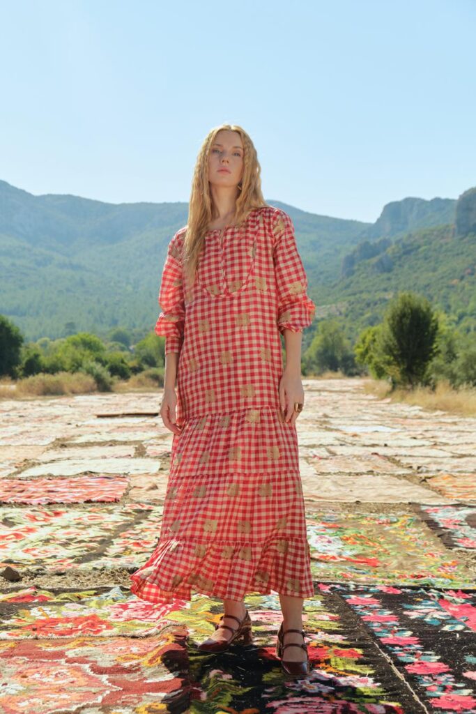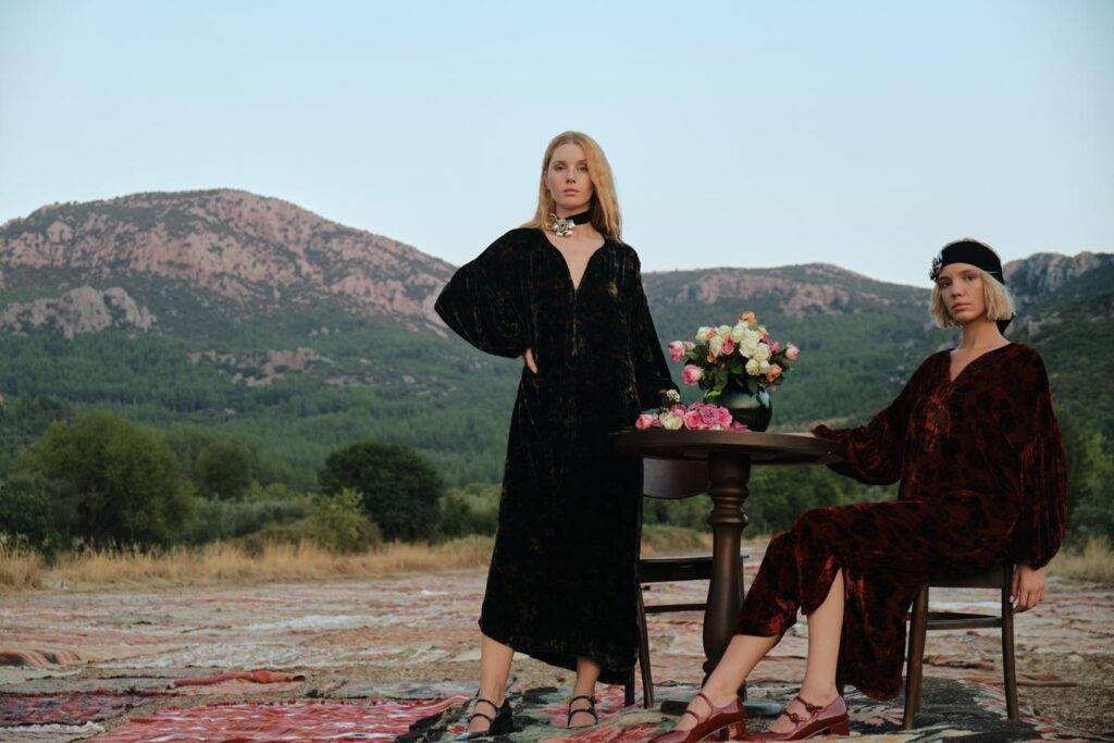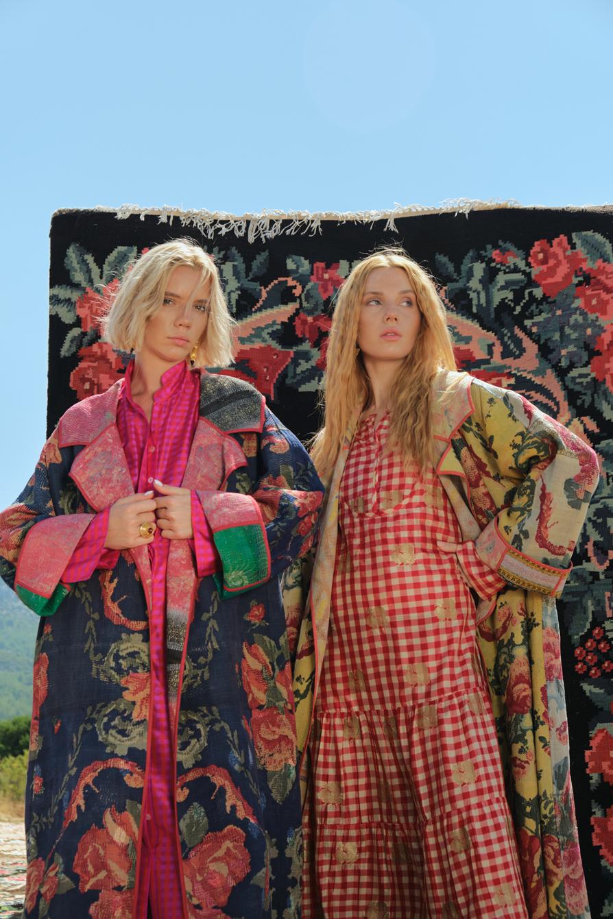 A coleção revisita diversos padrões florais simbólicos que significam proteção, abundância e ligação com a terra. Milhares destes tapetes estendidos sob o sol, nos campos abertos de Antália, surgem em vestidos, casacos e lenços em seda e veludo de seda compostos por bordados minuciosos e brocados luminosos, peças marcadas pela cartografia sensorial de texturas genuínas.