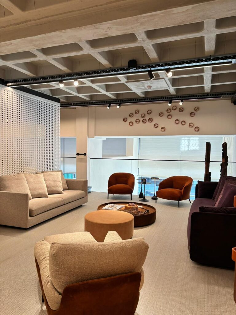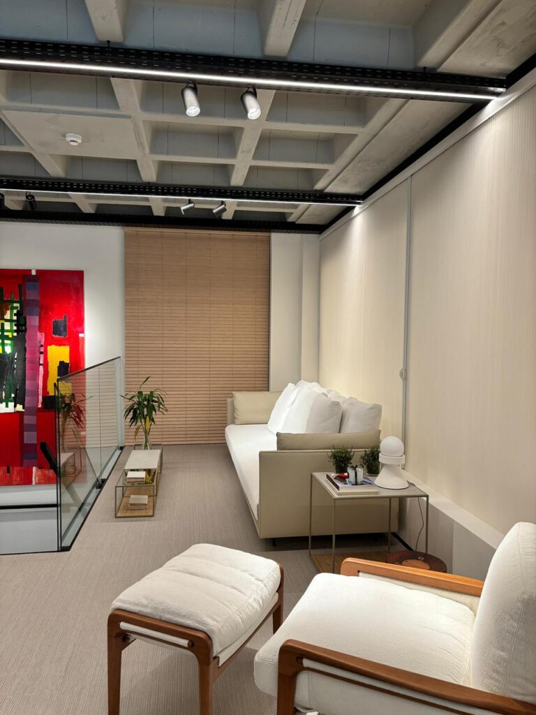 Estofados e mobiliários que estão no mezanino da loja são assinados pela Decameron, exceto o bar.