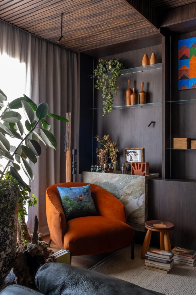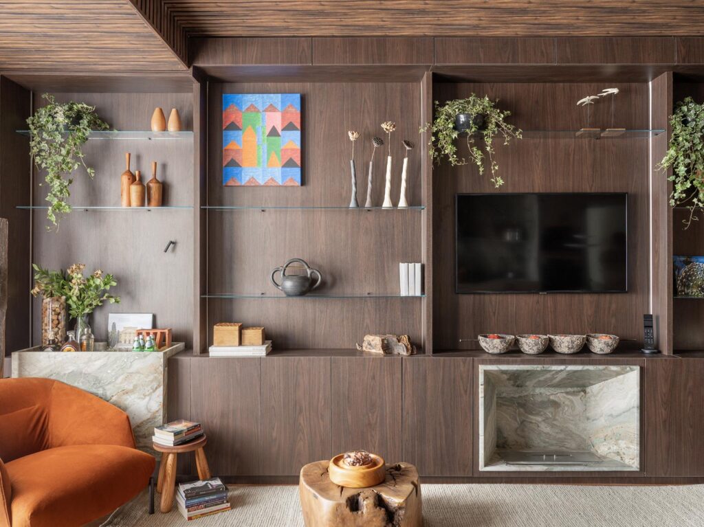 Cotista e fornecedora do ambiente “Entre Tons e Texturas”, assinado pelo arquiteto Leonardo Simões, a Revelo participa com uma curadoria completa que reúne móveis, objetos autorais de decoração, tapete e cortinas.