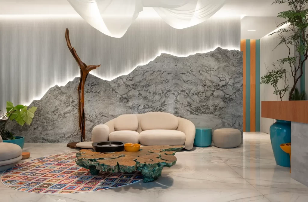 Todo sonho precisa de um portal. Um lugar de passagem. Este espaço de 70 m2 nos convida a desacelerar e abrir caminho para o que existe de mais leve, fluido e sensorial. Cada elemento conta uma história silenciosa e sensível. Tecidos flutuantes no teto, cores vibrantes e a mistura de materiais naturais fazem desse espaço um convite à conexão com o lúdico, com o que é leve e quase irreal. Luz dos Sonhos é um portal delicado, onde o invisível é sentido e o sonho encontra espaço para brotar.